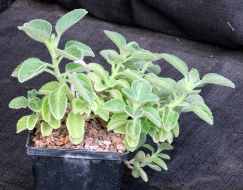 This species occurs in a broad range from Saudi Arabia to India and Ethiopia to Tanzania. Plectranthus barbatus has hairy semisucculent leaves that are aromatic and forms a woody, non-succulent stem. This species puts up spikes of attractive purple flowers in the fall and early winter. These plants are rooted cuttings in 5-inch pots. They can be planted in the ground in warmer climates, or they make excellent hanging plant subjects.