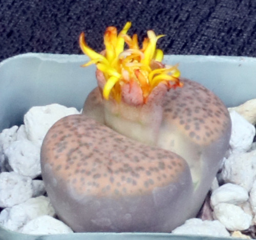 This species is from southern Namibia, where it grows well inland in the zone between summer and winter precipitation. The body is an orange-green color and is relatively small. The flowers are white. These plants are seedlings in 2-inch pots.