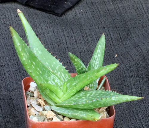 These plants, which were ISI 2001-24, originally came from propagules originating in the Northern Province of South Africa. Another cremnophilous species, growing primarily on cliffs, this species forms small clumps of rosettes bearing light green, white-spotted leaves. The flowers are pink and borne in dense, capitate inflorescences. This species took 18F recently in Tucson with minimal damage. These plants are rooted offsets in 4-inch pots.