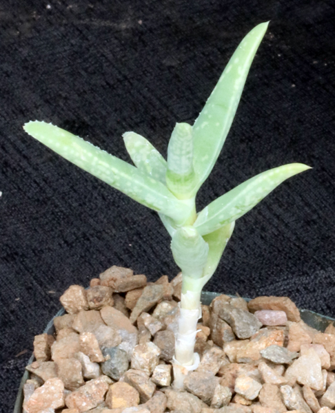 This slow-growing, cremnophilous species is from Oman (HBG127148). The small, offsetting rosettes bear yellow-green leaves that are highly succulent, white spotted, and somewhat fragile. The flowers are white, which is an unusual color for this genus. These plants are rooted offsets in 4-inch pots.