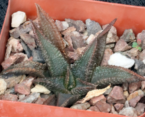 This species is from the Mpumalanga Province of South Africa and is one of the few Haworthias that is subject to mostly summer rainfall. The color is a beautiful burgundy, with bronze-colored leaves. These seedlings are in 4-inch pots.