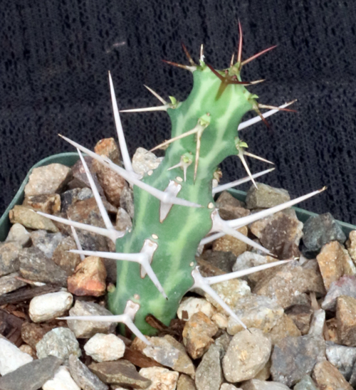 From the North-East Province of Kenya, this species has a thick, fleshy stem and sprawling (and we mean that) stems that are extremely thorny. One thing about those stems -- they are beautifully marked. This species makes a great hanging plant as long as it is out of harm’s way. These are rooted cuttings in 4-inch pots.