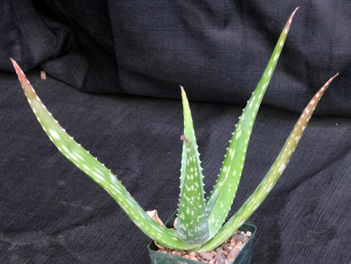 Aloe turkanensis, previously rare in cultivation, is a distinctive maculate species from the Rift Valley of northern Kenya. What really sets this species apart are the large white spots on the light-green leaves. These plants are from seed from Lake Baringo, south of the species namesake Lake Turkana. Our plants are seedlings in 4-inch pots.