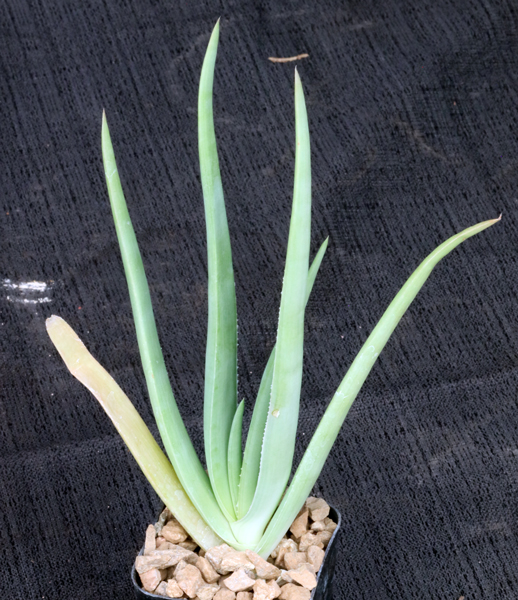 This tree Aloe is from the borderlands of Kenya and Tanzania. These plants are propagated from material originally collected near Taita Ngambwa, Kenya (WY 1044). One of the few poisonous Aloes, it has unspotted yellow-green leaves and a smooth trunk with no leaf remnants. The flowers are red. These plants are seedlings in 2-inch pots.