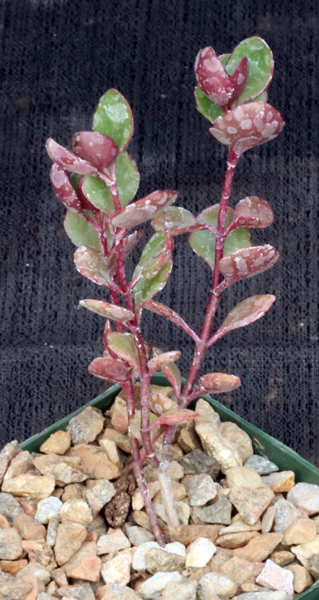 This cultivar is of an origin unknown to us, but it has nice trailing stems with succulent reddish-green leaves and red-orange campanulate flowers. These plants are rooted cuttings in 4-inch pots.
