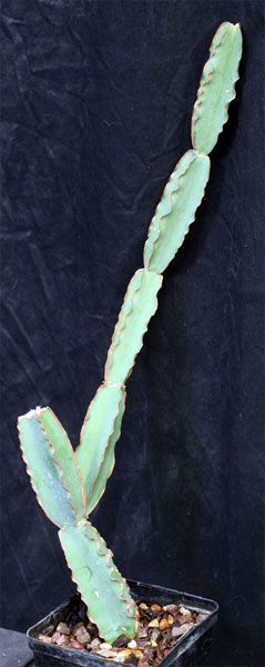 This species, which ranges widely on the eastern side of Africa, is a climbing succulent vine. These plants are propagated from material originally collected from eastern Kenya (WY 1203). Once you see those leaves, you readily put it in the Vitaceae (grape) family. The stems are quadrangular with wavy margins between the nodes. This clone has a blue-green body with pinkish-red wavy margins and the stem is a little more robust than the typical form. We offer rooted cuttings of this species in 4-inch pots.