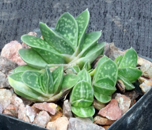 This little hybrid is of uncertain parentage. It is a tiny, slow growing plant that forms nice little mounds of upright leaves. These plants are rooted offsets in 2-inch pots.