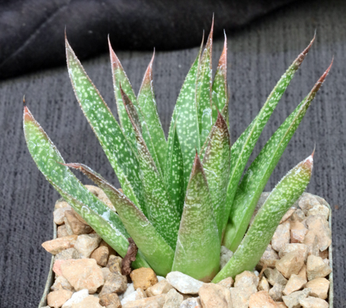This Gasteria hybrid has broad, triangular leaves with patterning, reddish hues, and numerous white spots. The flowers are held in a multi-branched inflorescence and are orange. These plants are rooted offsets in 4-inch pots.