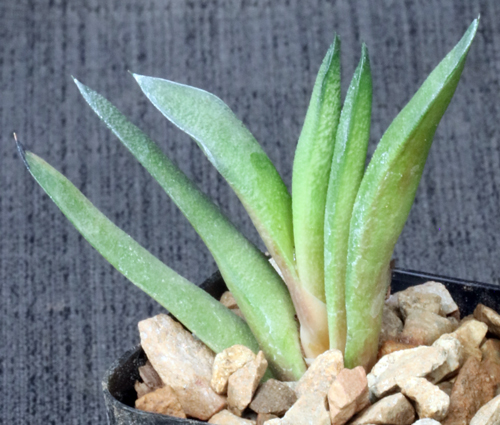 This is a very interesting hybrid Gasteria developed in Japan crossed with G. glomerata, a species with a gray epidermis. The plants have the bluish-green cast of Blue Ox with few if any spots, which occurs in perhaps one-half of the seedlings from this hybrid. These plants are expected to grow into relatively large plants, and they are seedlings in 2-inch pots.