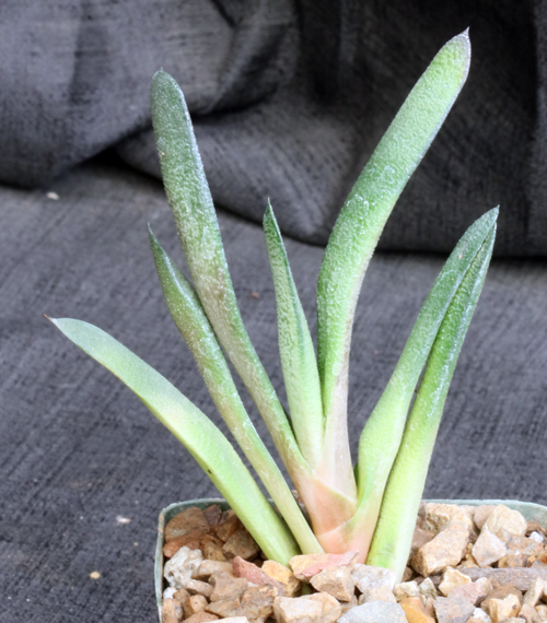This is a very interesting hybrid Gasteria developed in Japan crossed with G. glomerata, a species with a gray epidermis. The plants have the bluish-green cast of Blue Ox with few if any spots, which occurs in perhaps one-half of the seedlings from this hybrid. These plants are expected to grow into relatively large plants, and they are seedlings in 4-inch pots.
