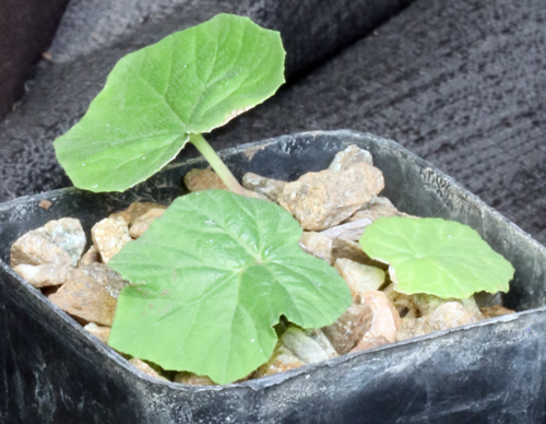 Dorstenia drakena is a species from northwestern Mexico, particularly Sonora, that has relatively large dark green leaves that have irregular margins. The plants typically are acaulescent and are not easily raised. The flower receptacle is cup-shaped and on a relatively long peduncle. We have seedlings of this species in 2-inch pots.