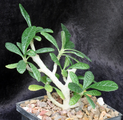 The largest species in the genus and one of the most desirable is from the island of Socotra (Yemen), where it grows from vertical limestone cliffs. These plants have light green stems and distinctive dark-green lanceolate leaves. These plants are rooted cuttings in 5-inch pots.