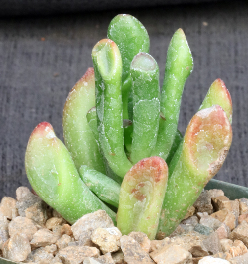 This species is from the southeastern provinces of South Africa. This shrub typically grows on rock outcrops and generally has ovate leaves, as the epithet suggests, with some exceptions. The cultivar Gollum has cylindrical leaves that appear truncated on the ends and variously colored in green and red shades. The inflorescence bears numerous white-pink, smallish flowers. These plants are rooted offsets in 4-inch pots.