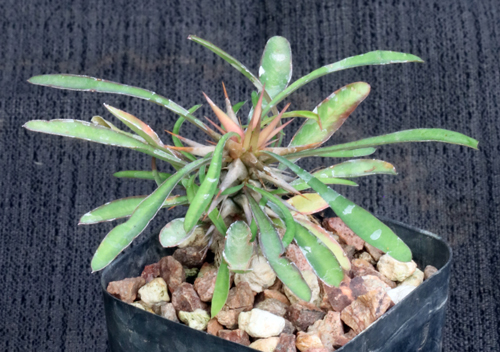 One of the nicest of the Madagascan Euphorbias E. rossii has short, thick-branched stems with many thickened spines. The leaves are lanceolate to thread-like, and the cyathia are yellow. We offer this species in 2-inch pots.