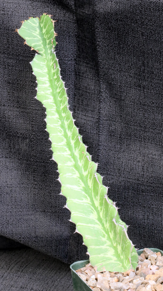This tree Euphorbia is interesting because of the wavy, bright green branches that are 2- to 3-angled. This variegate form has yellow veins that stand out strikingly against the green background. The cyathia are yellow. These plants are rooted cuttings in 4-inch pots.