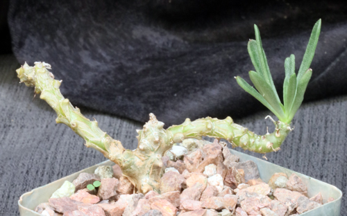 This species, from near Komkaus in South Africa, has channeled, linear leaves and a trunk with faint striping. The tuberous root is large, eventually creating a caudiciform base. These rooted cuttings are in 4-inch pots.