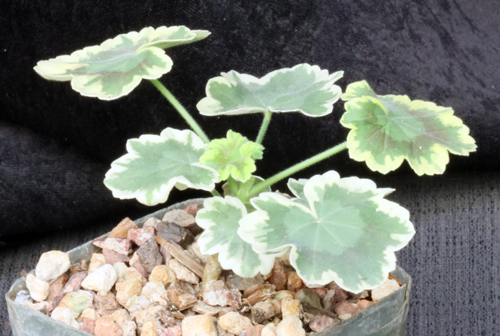 Pelargonium cv Mrs. Pollock is a shrubby cultivar. The leaves are bicolor to tricolor with yellow, red, and light green in the mix. The leaves are tri-lobate in form. The small flowers are a brilliant red. These plants are rooted cuttings in 4-inch pots.