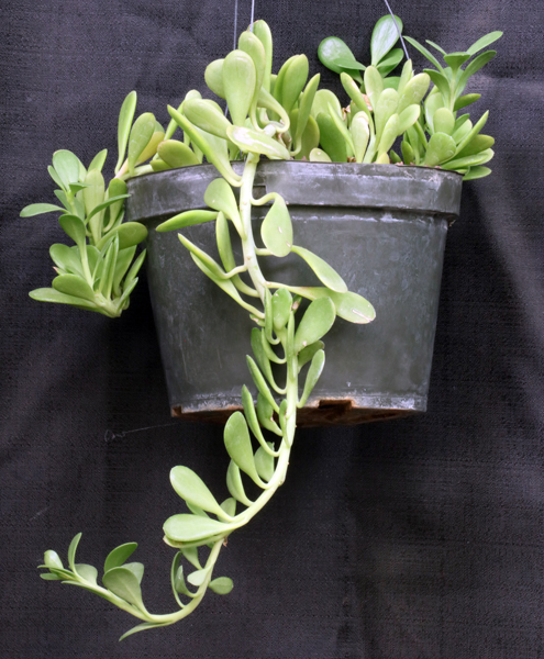 This prostrate succulent plant is from Kenya and Tanzania. Our material came from near Naivasha, Kenya (WY 1183). These plants have light green, suborbicular and succulent leaves on vine-like stems; this makes a great hanging plant. The flowers are orange-red. These plants are rooted cuttings in 10-inch pots.