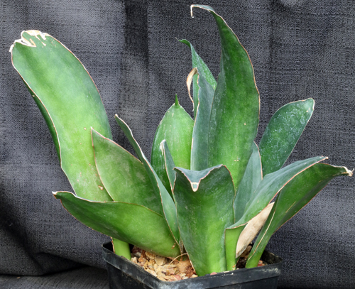 From Zaire, this broad-leaf species has spreading, dark brown-green leaves. Unlike most species, our plants have view bands, and what banding occurs is quite faint. This is an attractive low-growing species. These plants are rooted offsets in 5-inch pots.