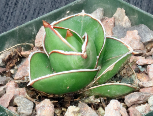 This species was originally collected by Lavranos (Lav 23154) north of Mogadishu, Somalia. These slow-growing plants tend to have a revolute form when young, changing to a distichous form with stout light-green unspotted leaves. The flowers tend to be mostly violet in color. These plants are seedlings in 4-inch pots.