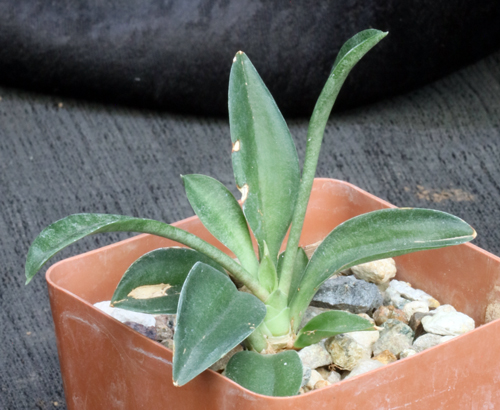This species, from the Lake Sibaya region of extreme eastern South Africa south of the Mozambique border, is clearly a form of S. concinna. According to Chahinian (2010), Dave Hardy collected this plant as Hardy (19879). The leaves are spoon-shaped and green with faint banding and are larger in cultivation than typical S. concinna. These plants are seedlings in 4-inch pots.