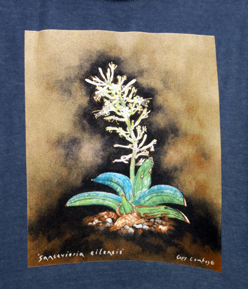 Our high-quality T-shirts (Comfort Colors Cotton T) have original artwork of Sansevieria eilensis on the front. The color of these shirts is denim.