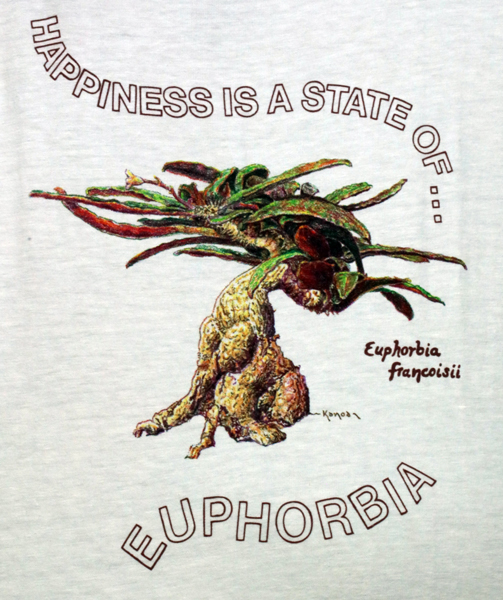 Our high-quality T-shirts (Comfort Color Cotton T) have original artwork of Euphorbia francoisii on the front. The color of these shirts is Ivory.