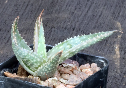From remote areas in central Madagascar, this species is an intermediate between Aloe bakeri and A. rauhii, but its location rules out a hybrid between these two. The leaves are a bluish-green with white streaking, and the flowers are orange with green floral lips and held on a short inflorescence. These plants are seedlings in 2-inch pots.