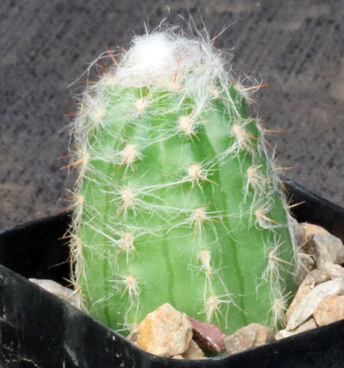 This short, columnar cactus, from southern Bolivia and northern Argentina, falls under the common name of "Old Man Cactus" or senita. The pale green stem shows through the dense wool and yellow spines. The flowers are tubular and light red in color. These plants are rooted cuttings in 2-inch pots.