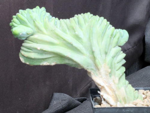 This species is widespread in north-central Mexico with its distribution centered on Tamaulipas. Known in the US as blue Mexican fencepost, this species characteristically has blue-green stems with small black spines. These plants are the cresting version of the typical species and are in various stages of cresting. The flowers are small and greenish-white and are produced in the summer. These plants are rooted cuttings in 5-inch pots.