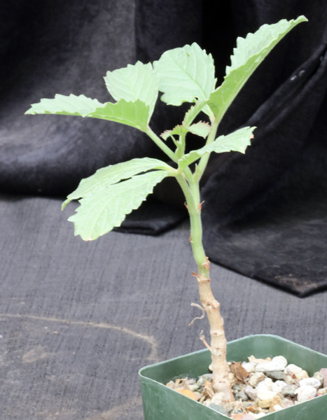 From the Northern Province of South Africa, this pachycaul succulent has a large, knobby base protruding from the ground. The stems are multibranched and produce 3-5 lobed leaves that are notable for their conspicuous veins and overall reddish tone, which can be quite vivid in some individuals. These plants are seedlings in 4-inch pots.