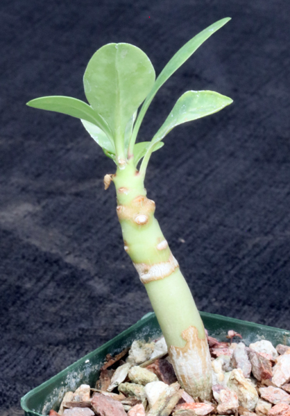 From northern Namibia, this species is a multibranched shrub to short tree. The stems are variously angled and green, and light green leaves with reddish bases decorate the ends of the stems. The cyathia are pale green. These plants are seedlings in 4-inch pots.