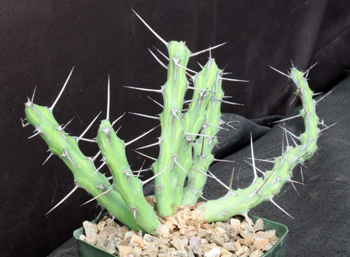 This tufted shrub, which has many variegate branches with very long spines, is from northern Kenya (Turkana District) and southern Ethiopia. Kali sans means "very fierce" in Swahili, which is an apt description. The cyathia are yellow. These plants are rooted cuttings in 5-inch pots.