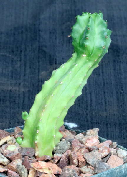 Euphorbia fruticosa is a clumping columnar species from the Haraz Mountains in Yemen. This species, with its yellow-green multifluted spiny stems, is stunning in bloom, when the tops of the columns are covered with yellow cyathia. These plants are rooted offsets in 4-inch pots.