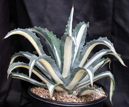 This proliferous Agave is from the large complex of A. americana in Mexico, and it can be considered as a cultivar for all intents and purposes. The numerous leaves are blue-gray with a center yellow-white stripe and are lined with small, sharp spines. We have grown this cultivar outside for decades in Tucson, where it can withstand frost to at least 18F. These plants are rooted offsets in 5-gallon pots.