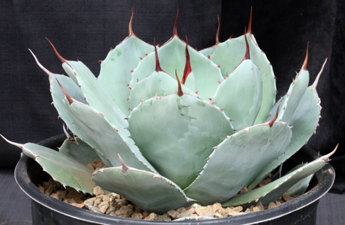 From northwestern Mexico, this medium-sized species does not offset significantly. Unlike several other varieties, var. truncata has a relatively open rosette of blue-green leaves and marginal spines. It can probably take freezing temperatures approaching 0 F. These plants are seedlings in 3-gallon pots.
