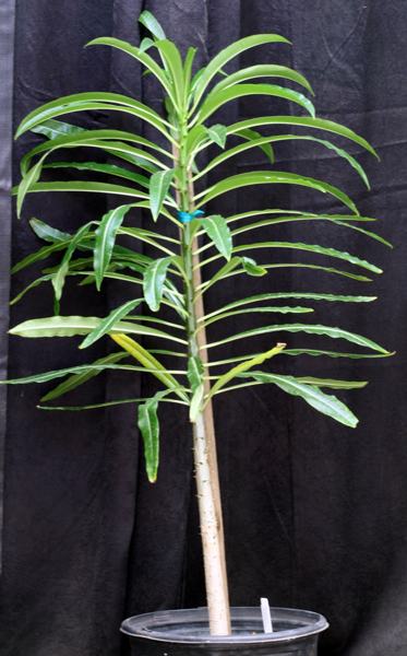 From northwestern Madagascar, this tree species has a distinctive spiny, slender stem and elliptical green leaves. The flowers are white. These plants are seedlings in 5-gallon pots.