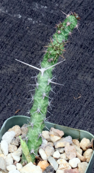 From the North-East Province of Kenya, where many interesting species grow, this small Euphorbia forms a densely branched shrub. The stems are highly colored with light green, yellow, and dark green patches. As the name suggests, the tubercles bear numerous spines of different length. The cyathia are pink-orange and quite beautiful for small flowers. These plants are rooted offsets in 2-inch pots.