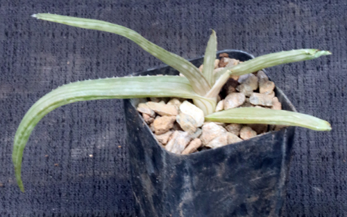 This cremnophilous species is from one locality in Angola. This offsetting species has short, pendulous stems producing a rosette of yellow-green white-spotted leaves. The flowers are orange-red. These plants are rooted offsets in 2-inch pots.