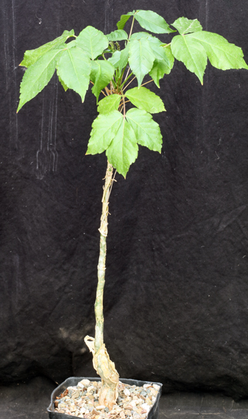From Ethiopia, Somalia, and particularly northeastern Kenya, this interesting Commiphora has yellow shredding bark that reveals a yellow-green substrate. The leave pedicels are persistent, giving a shaggy appearance to the stems. The leaves are yellow green with red highlights, both on the leaf margins and their pedicels. These plants are seedlings in one-gallon pots.
