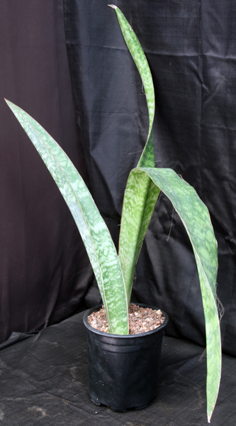 This is an undescribed species found in Malawi by a Dr. Sachsse from Austria. It differs from Sansevieria hyacinthoides with its stiff green leaves that have prominent blotches and dull tips. These plants are rooted offsets in 3-gallon pots.