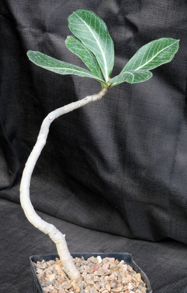 We are releasing Mark Dimmitts hybrid Adenium Arabian Ruby, with this offering. This hybrid is a cross between the well-known hybrid Adenium obesum Black Ruby with the Shada form of Adenium arabicum, which comes from the Jebel Shada in Saudi Arabia. This is a very unusual Adenium because the leaves create scars on the stem, which cause the stem to grow in a zigzag pattern. The flowers are a stunning rose-red color with a yellow-white striped throat, and they are borne year-round in a greenhouse setting. These plants are seedlings in one-gallon pots.