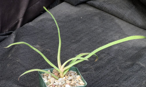 From Madagascar, this species tends to form a small shrub with numerous offsetting stems. The stems and leaves are yellow-green, and the leaves are nearly linear with small reddish teeth on the margins. The flowers are red with greenish-white tips. We find this species somewhat difficult to grow in Tucsons heat and low humidity and it definitely is not frost hardy. These plants are seedlings in 4-inch pots.