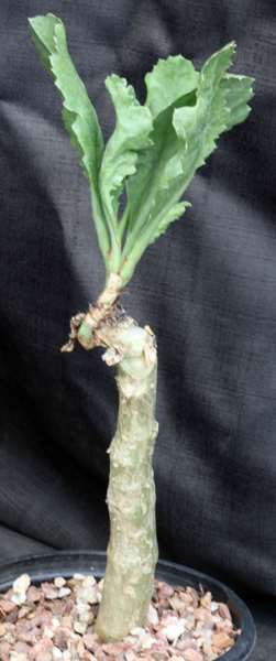 Cyphostemma juttae, which typically occurs in the Proto-Namib Desert of Namibia, forms a conical trunk that seldom exceeds about 3 feet in height in the wild. This beautiful dwarf succulent is noted for that yellow-brown trunk with its thin peeling bark and grey-green leaves. What typically distinguishes the leaves are wings at the attachment point of the petiole to the leaf. These plants are seedlings in one-gallon pots.