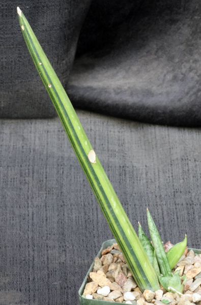 This species is from southern Africa, typically from the arid and semiarid areas in the southwestern part of the continent. The leaves are narrow with a prominent upper channel and characteristic smaller channels all around. These plants are yellow-striped variegates. These plants are rooted cuttings in 4-inch pots.