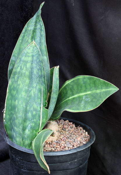 Sold for years as Sansevieria Mason Congo, this species is from the Congo and was collected originally by Mason. These plants have large, light green leaves with a distinctive pattern of white spots and mottling but also have varying amounts of yellow striping that occurs vertically within the field or along the margin. We find that the best coloration occurs in less light, as these no doubt are forest plants. The leaves from some of our plants have reached 4-feet high upright. These plants are rooted offsets in 3-gallon pots.