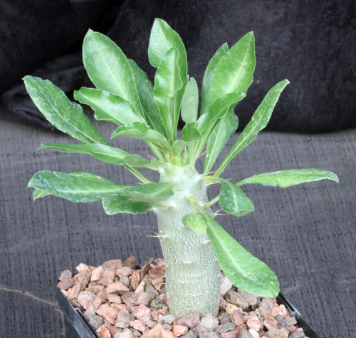 From southern Zimbabwe to the northern provinces of South Africa, this species has a swollen caudex, spiny stems, lanceolate-ovate leaves, and white flowers with pinkish throat produced in the fall. Pachypodium saundersii is very easy to grow large and flowers at about this size. These seedlings are in 5-inch pots.