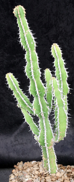 From Mozambique, this small tree has many thick, spiny branches on a short main stem. The branches are 6-angled and have regular constrictions. The cyathia are yellow and clustered near the tips of the branches. These plants are rooted cuttings in one-gallon pots.