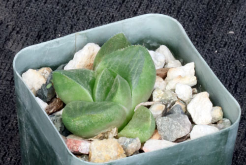 These plants are a cross between unknown Haworthias and(or) Haworthia hybrids. It looks like a very glossy form of Haworthia retusa. The cross was made by Kevin Hosmer. These plants are seedlings in 2-inch pots.