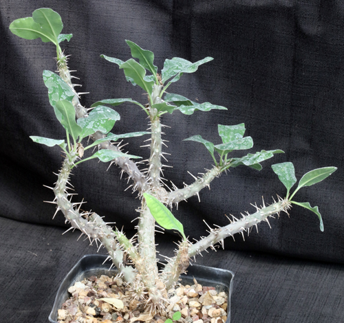 From Madagascar, this shrubby, spineless shrub has light green stems and lanceolate leaves. The cyathia are green, and the seeds are hairy. These plants are seedlings in one-gallon pots.